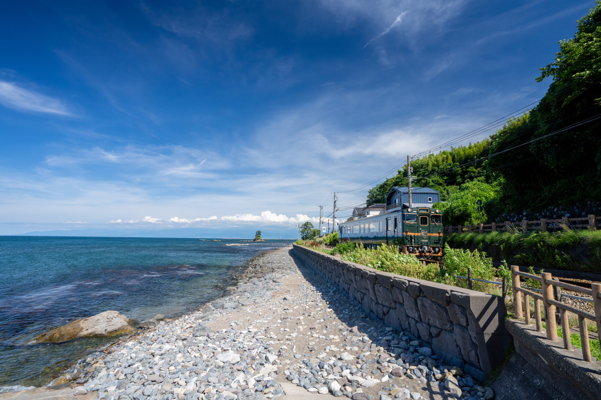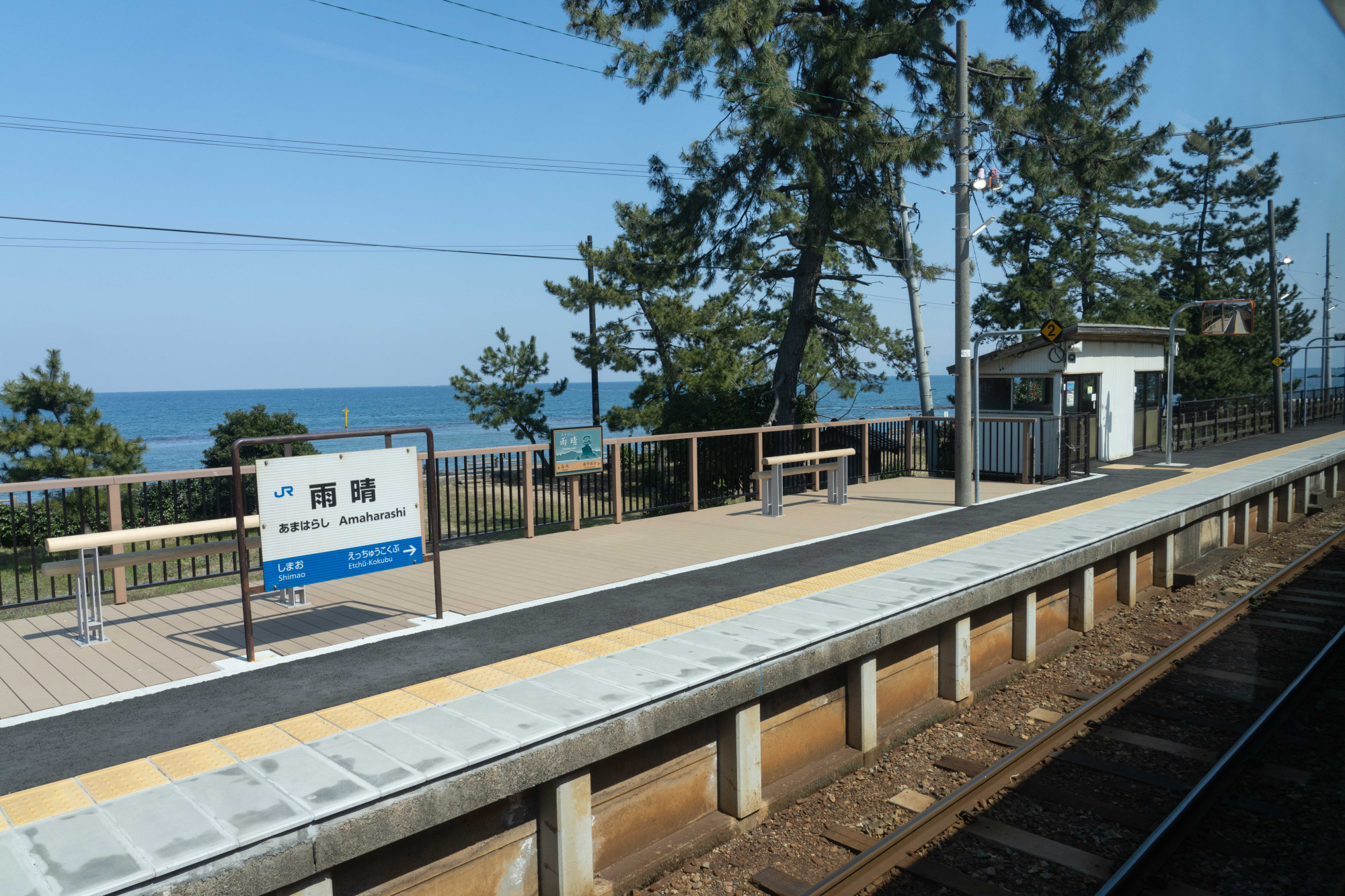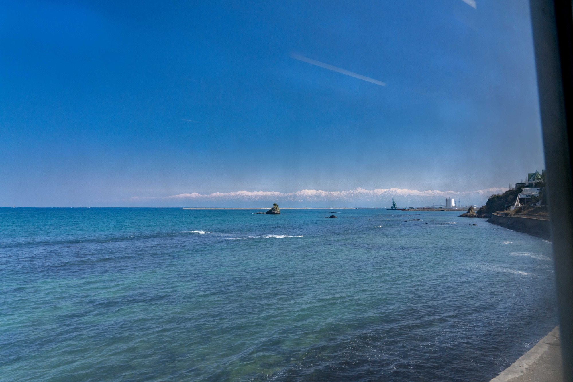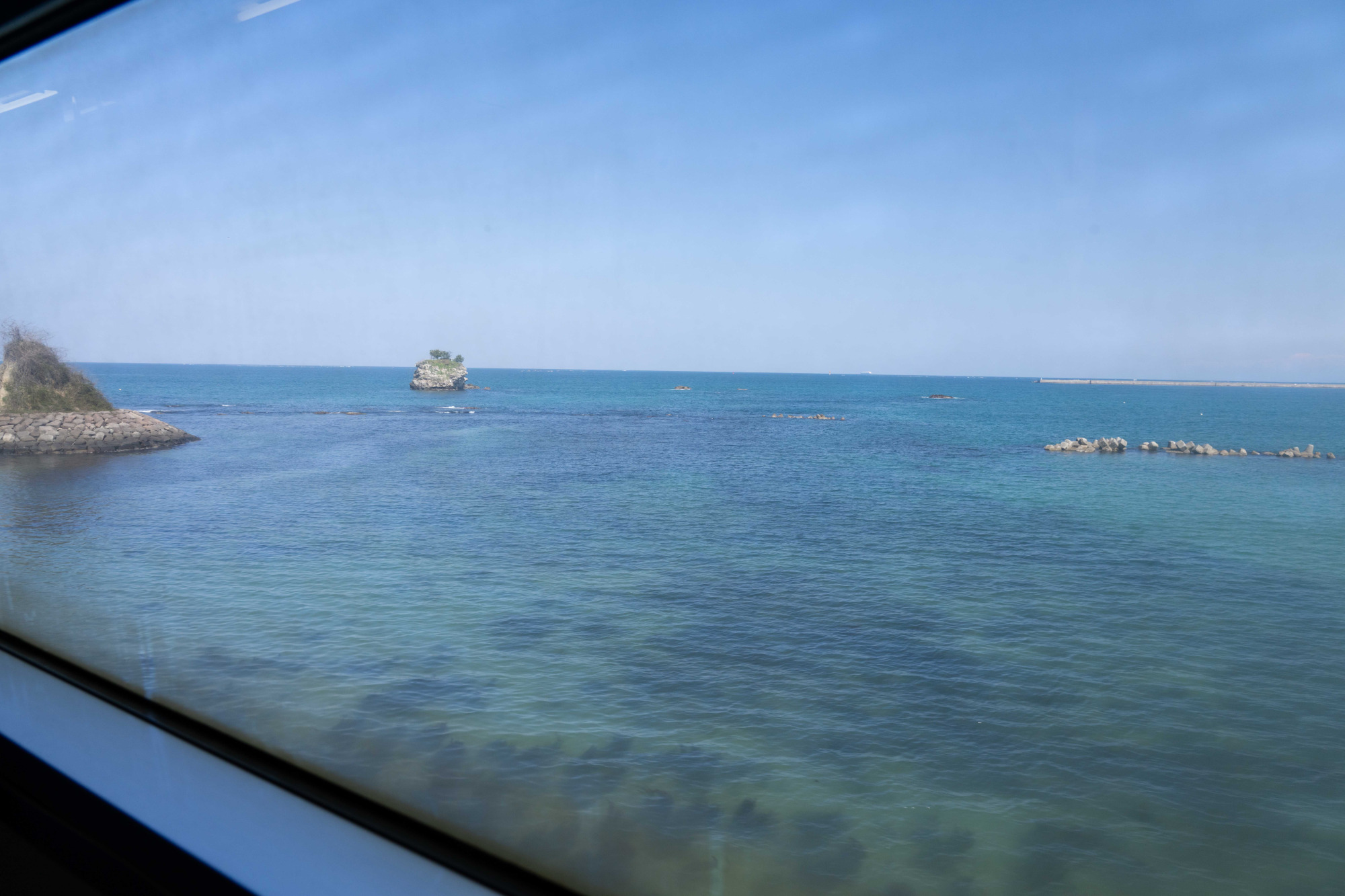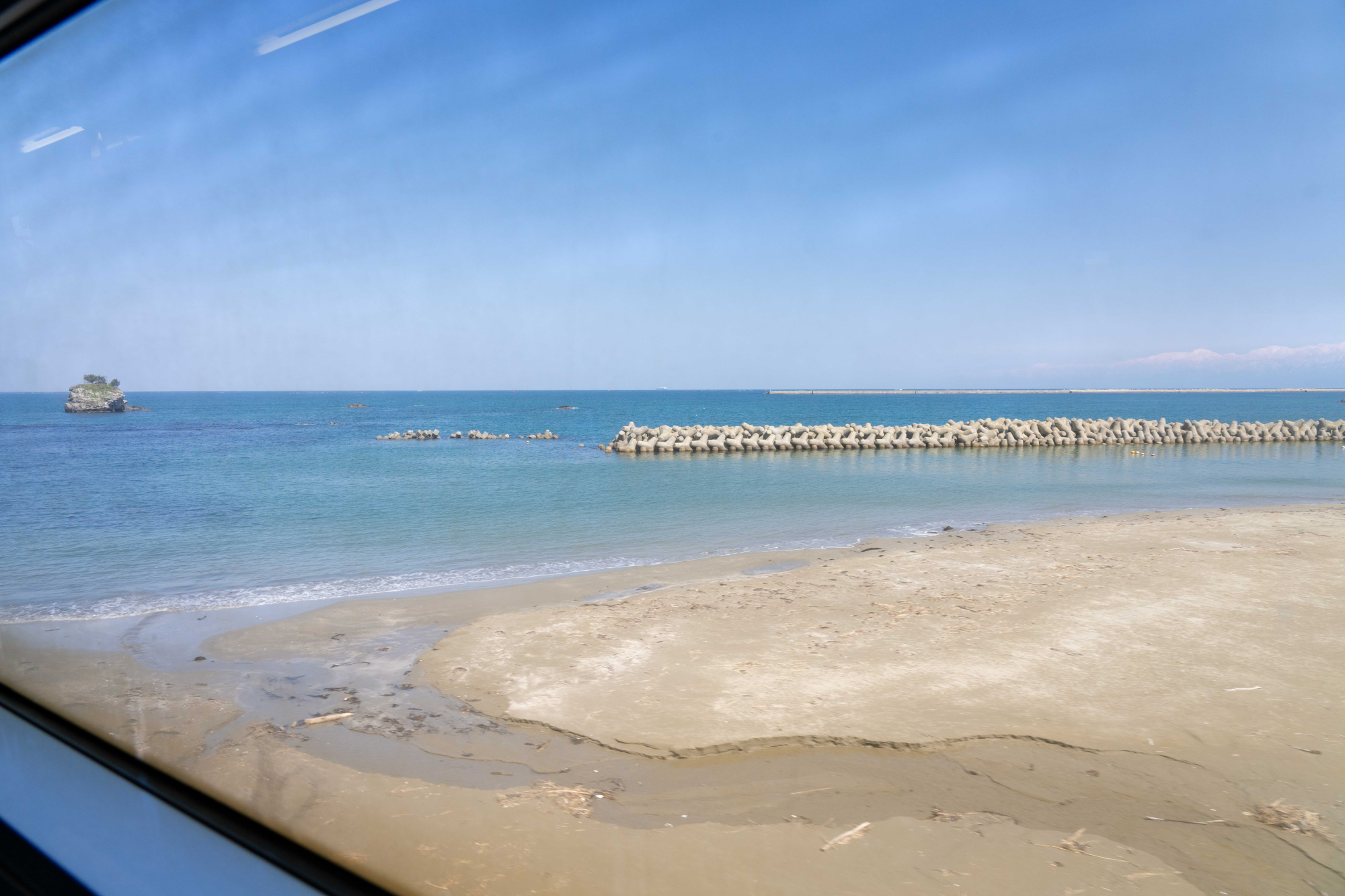 高岡駅を出てしばらくは、学校や住宅の塀すれすれを走り抜けるので、ここもまた面白い。そして「越中国分(えっちゅうこくぶ)駅」を過ぎると、風景は一変、オーシャンビューとなります!