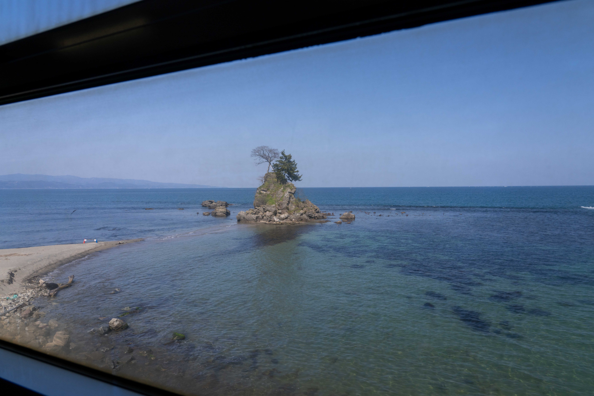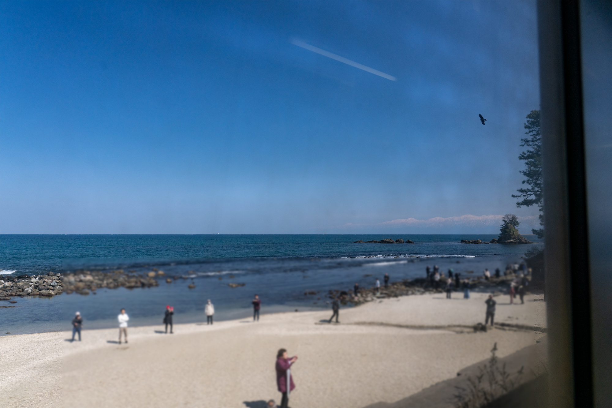 雨晴海岸のシンボル「女岩(めいわ)」。数日前の引き潮では、岩まで歩いて渡れる砂の道が現れるという珍しい現象もあったそうです(現在は潮が満ちて封鎖されていました)。