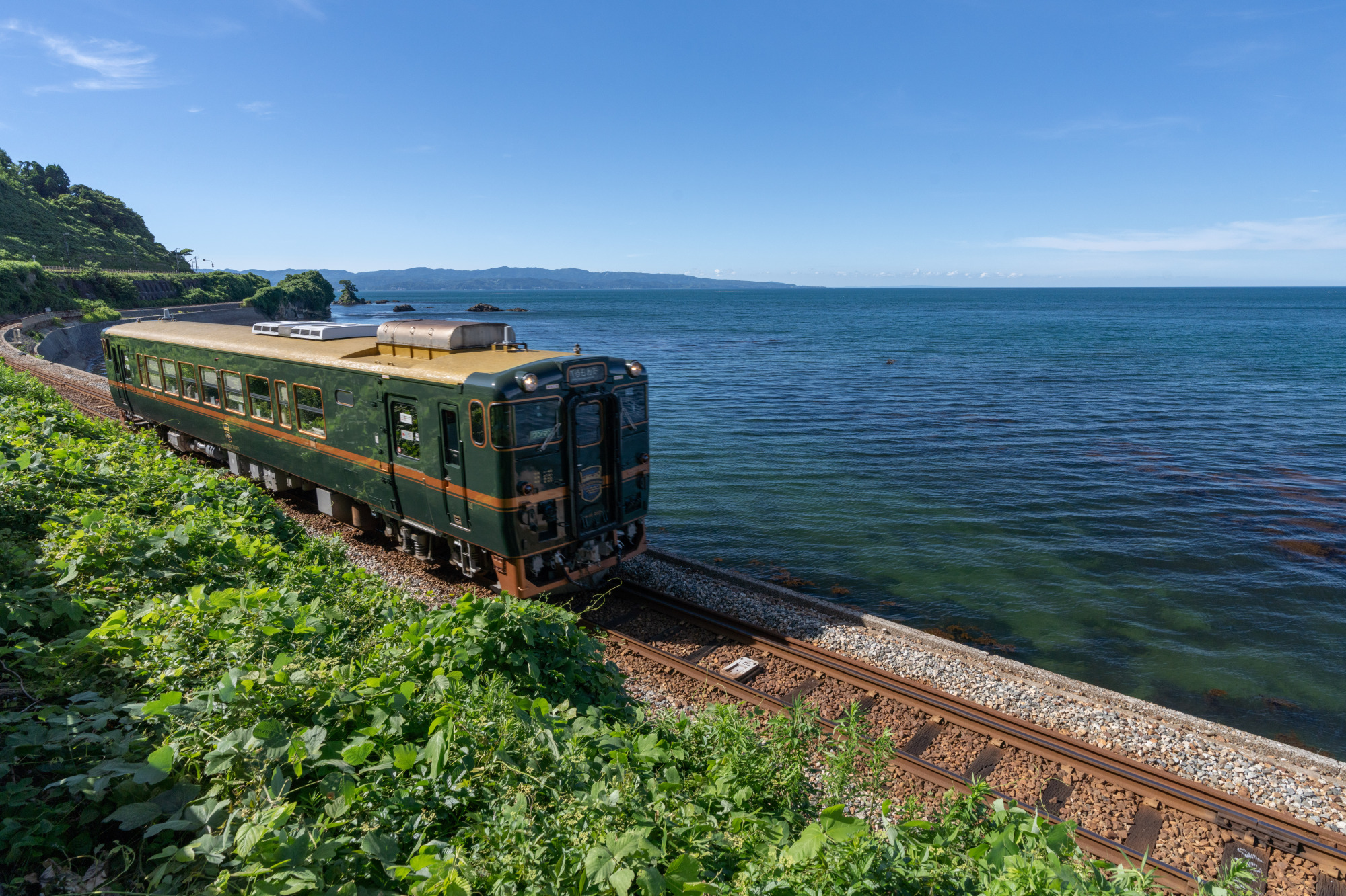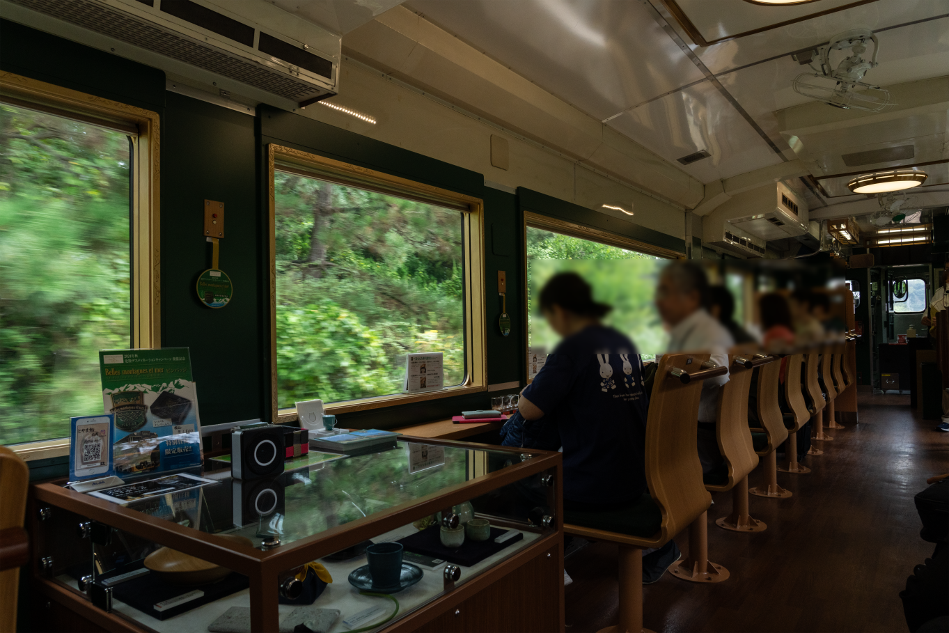 車内はまさに「走るギャラリー」。井波彫刻などの伝統工芸品が展示され、落ち着いた空間が広がります。雨晴海岸の絶景ポイントでは、列車が一時停車(または徐行)してくれる嬉しいサービスも。地元のガイドさんによる丁寧な解説を聞きながら眺める富山湾は、いつもの車窓とは一味違う特別なものに感じられます。