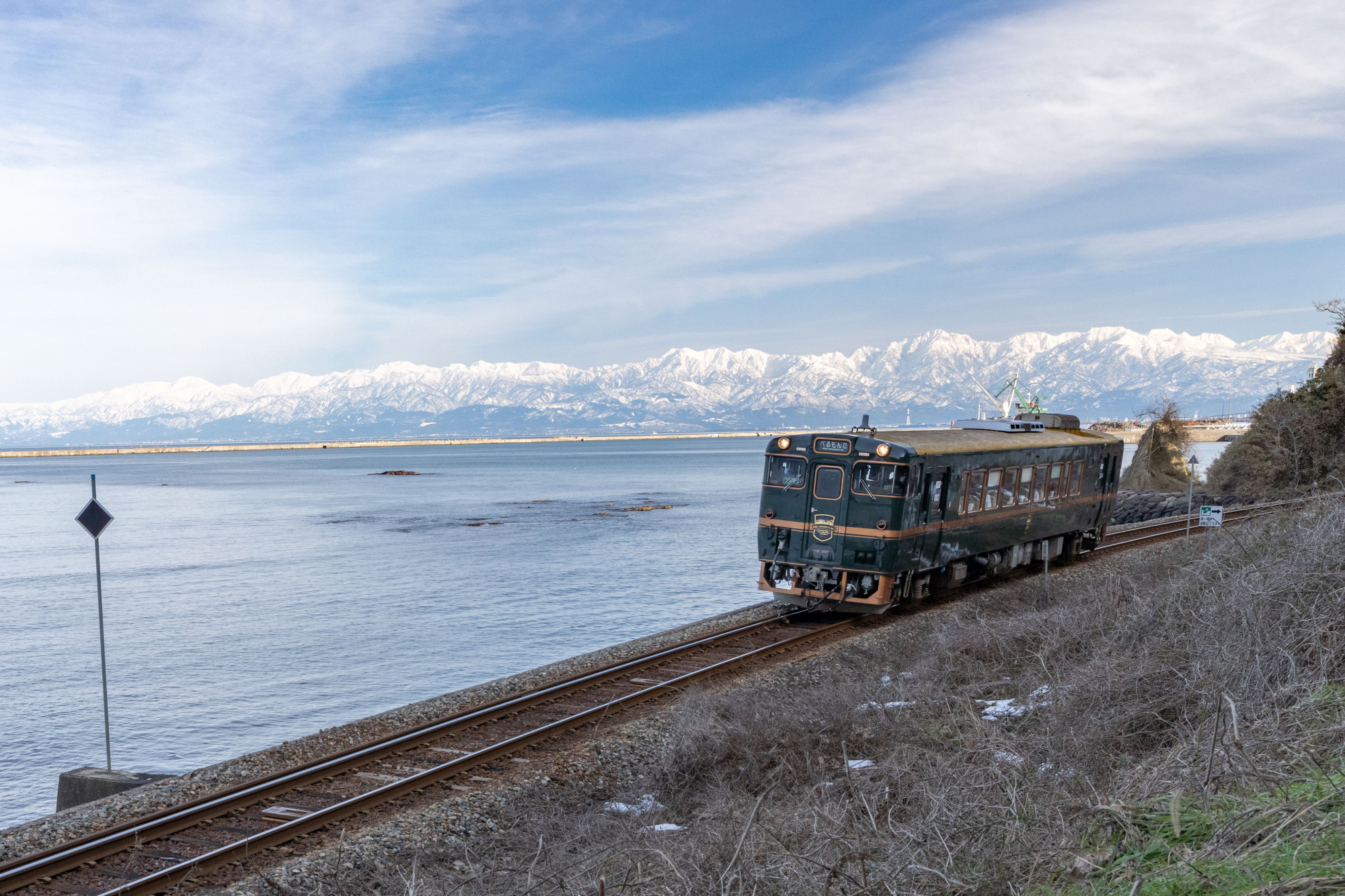 観光列車と聞くと「高額で敷居が高そう」というイメージがありますが、週末を中心に氷見線・城端線を走る「べるもんた(ベル・モンターニュ・エ・メール)」は、通常の乗車料金にプラス530円の座席指定券を追加するだけで乗車できてしまいます。