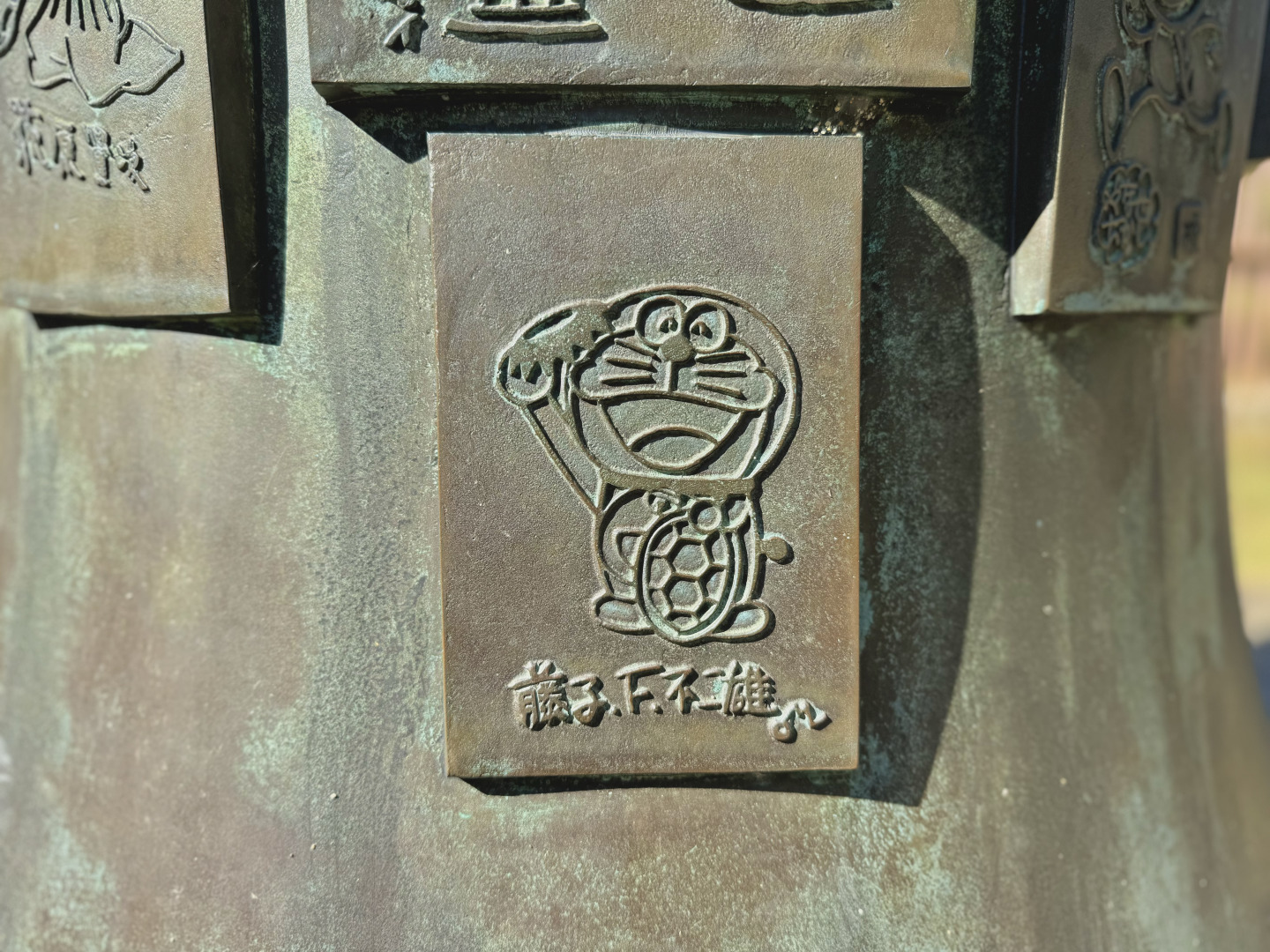 ブロンズのモニュメントをぐるりと囲むようにレリーフが並べられています。河童に扮したキャラクターが、遊び心たっぷりに描かれていて、藤子・F・不二雄先生はドラえもんを描いています。ほかにも手塚治虫先生作の河童頭の鉄腕アトムなども!お気に入りのキャラクターを探してみてください!