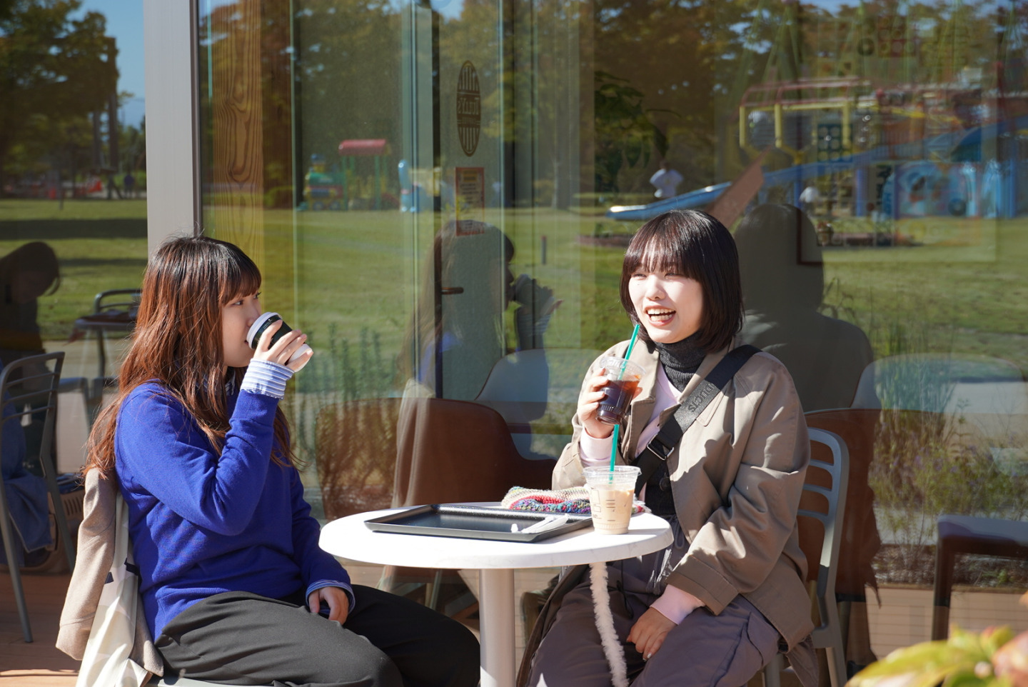 公園の豊かな緑を眺めながら、一息つけるタリーズコーヒー。
