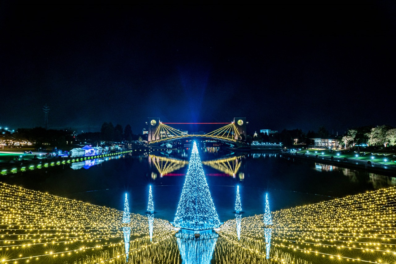 環水公園 冬の定番「スイートイルミネーション」。公園のシンボルである天門橋をライトアップするとともに、泉と滝の広場の円形の水盤に配置された白く輝くツリーを、周囲から中心に流れ落ちる光の滝が装飾します。