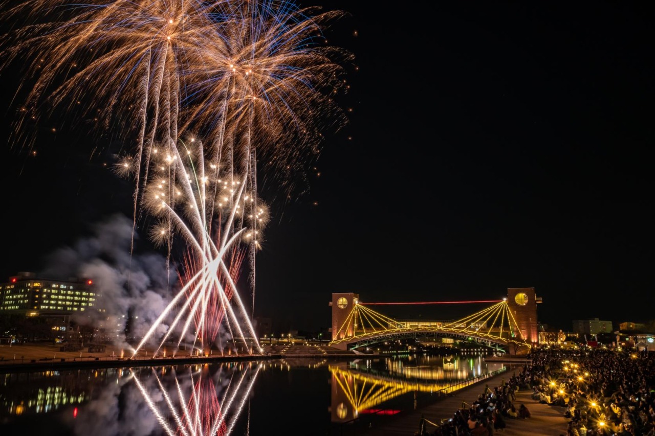 富山駅北口近く。富岩(ふがん)運河環水(かんすい)公園で過ごす特別なクリスマスイベントです。2026年3月1日(日)まで開催中「環水公園スイートイルミネーション」を楽しんだ後は、夜空を舞う、しゃぼん玉を使ったパフォーマンス、音楽と花火が織りなす華麗なシンフォニーをご覧いただける、貴重な1日。