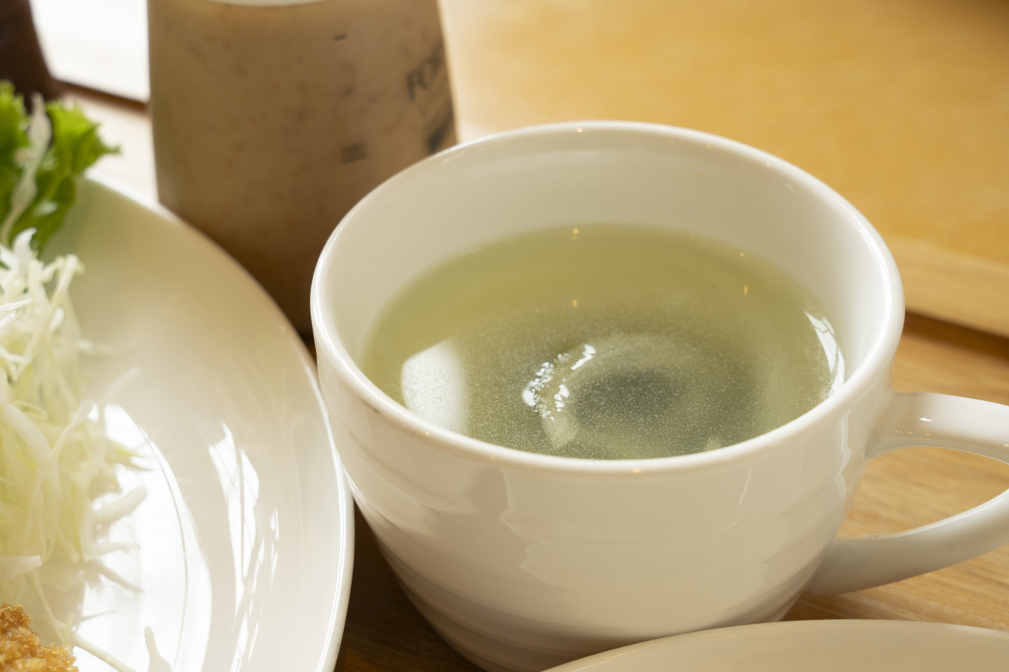 わかめと玉ねぎのスープが添えられ、ランチタイムをゆったり楽しめる満足の定食です。