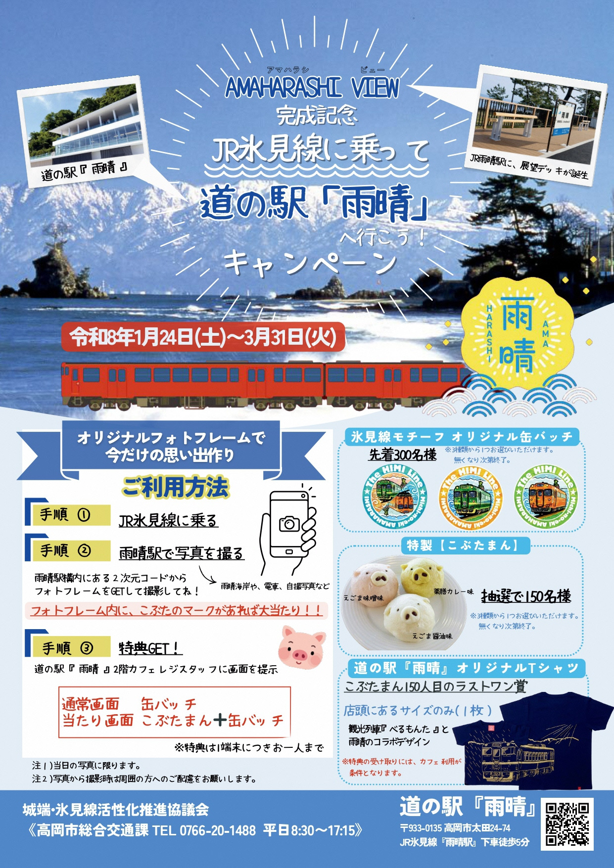 最寄り駅のJR雨晴駅構内に新しくデッキが完成したことを記念して、こぶたまん(特製肉まん)や、氷見線モチーフオリジナル缶バッチが当たる「JR氷見線に乗って道の駅『雨晴』へ行こう!キャンペーン」を実施します。