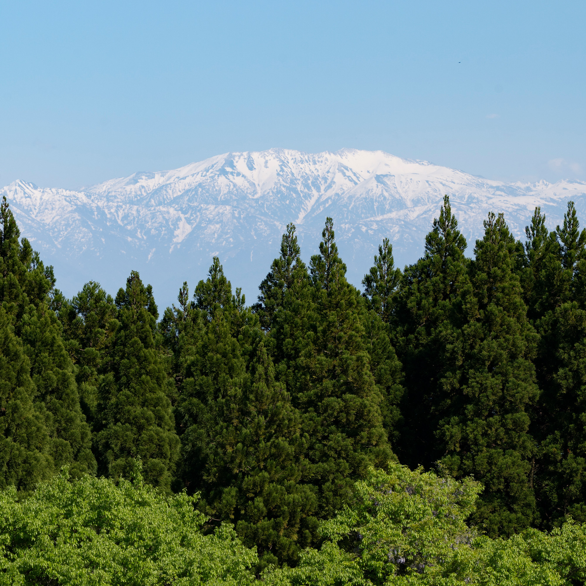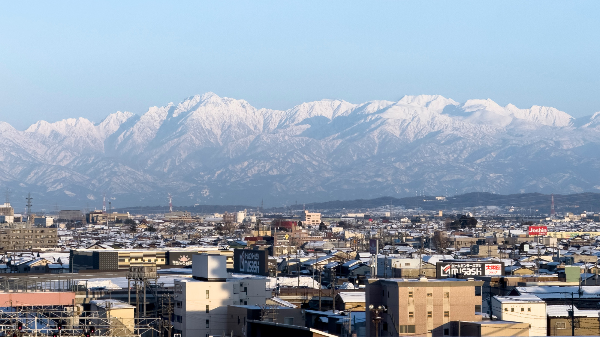晴れた朝には、澄んだ空気の中で、白く連なる山々が海の向こうに立ち上がるように見えます。
