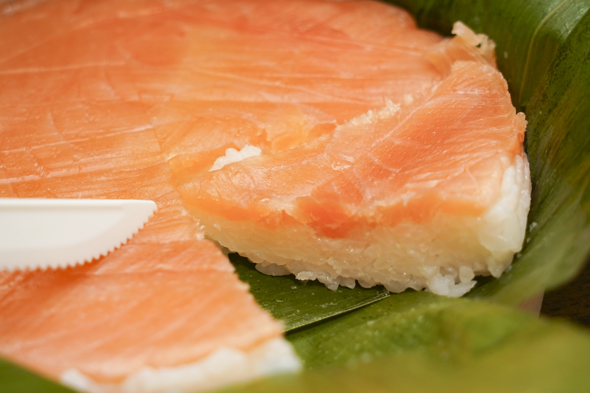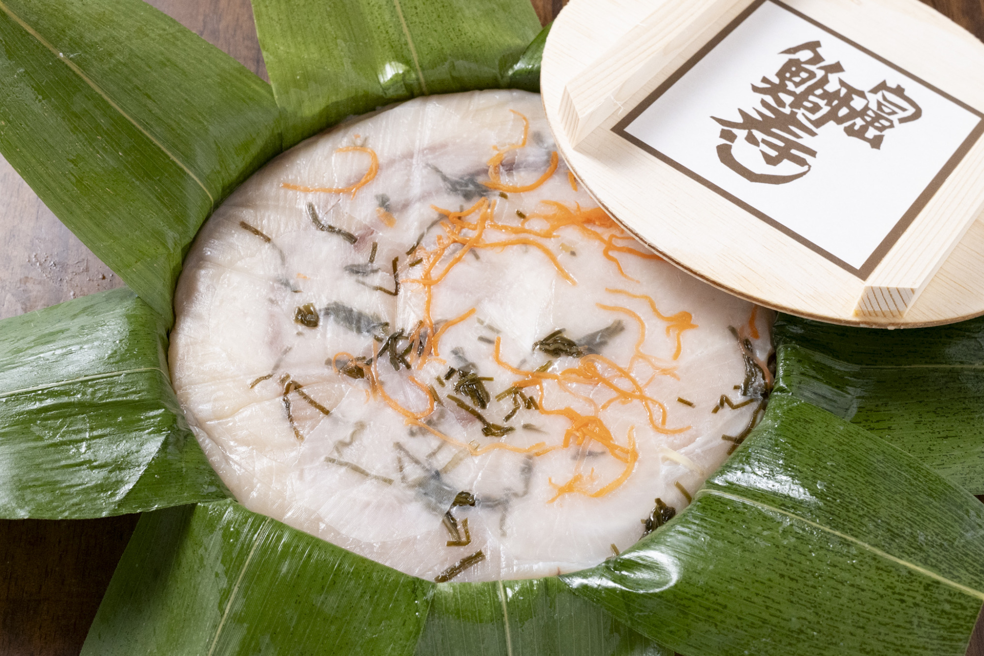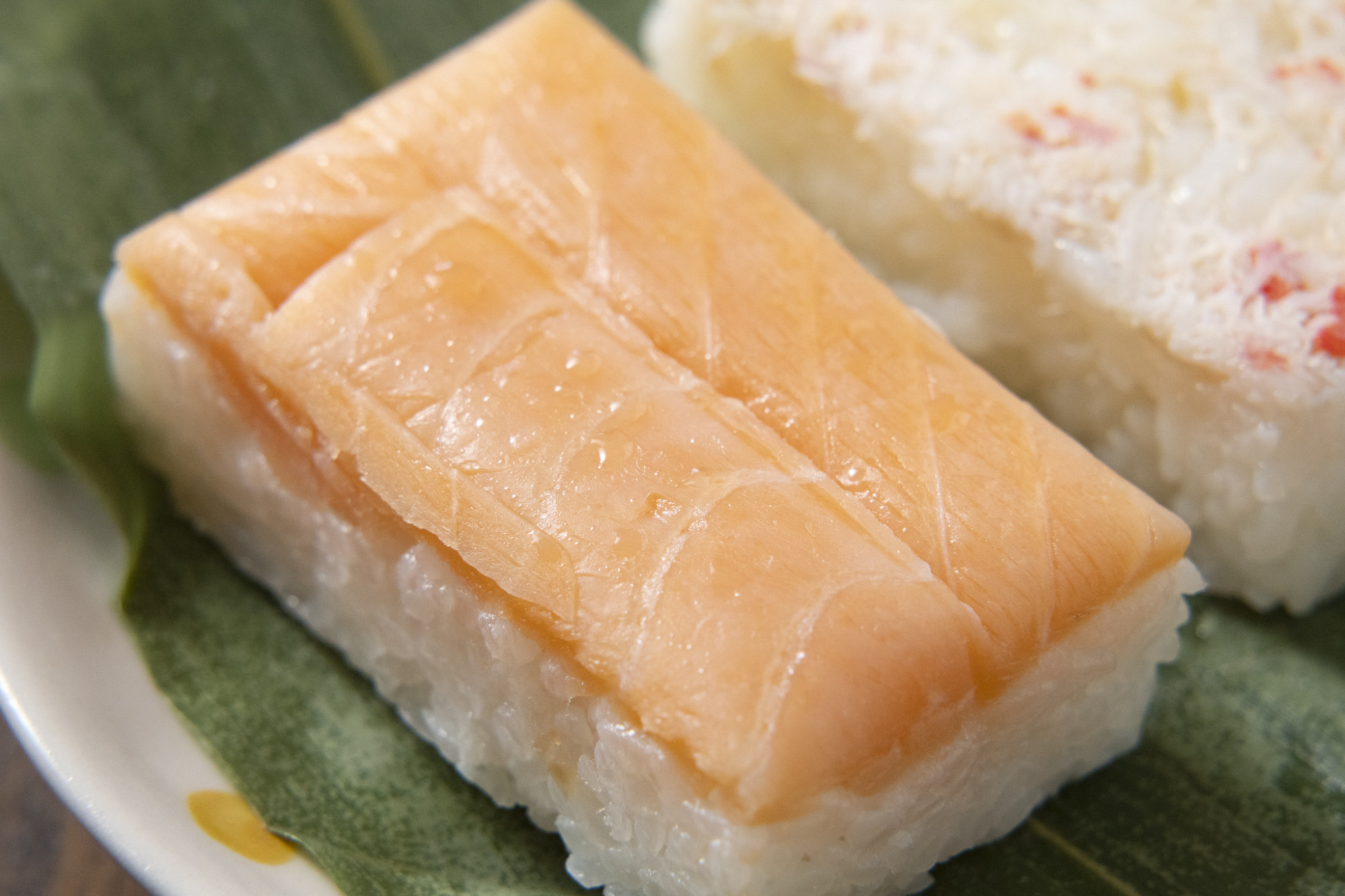 酢飯の上にますをのせ、笹で包んだ押し寿司で、丸い木桶の形も特徴的。
