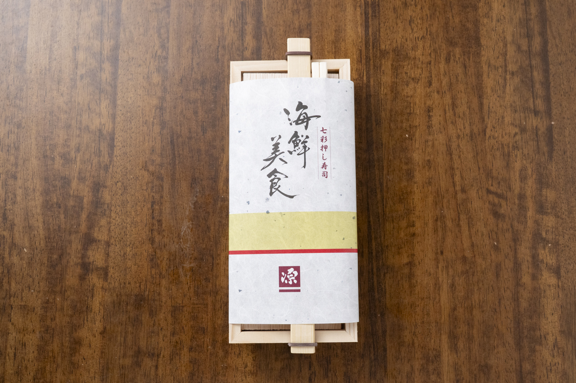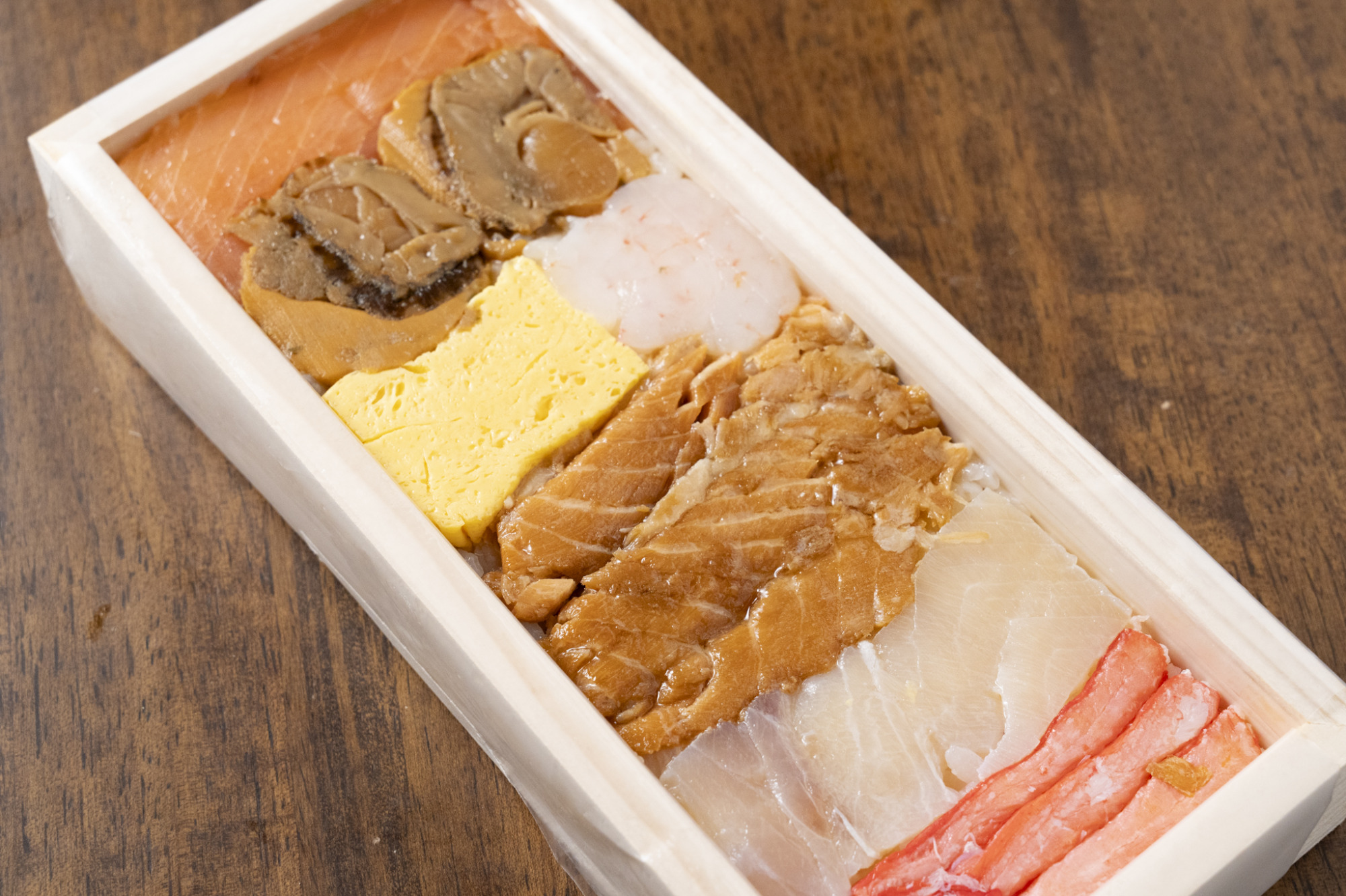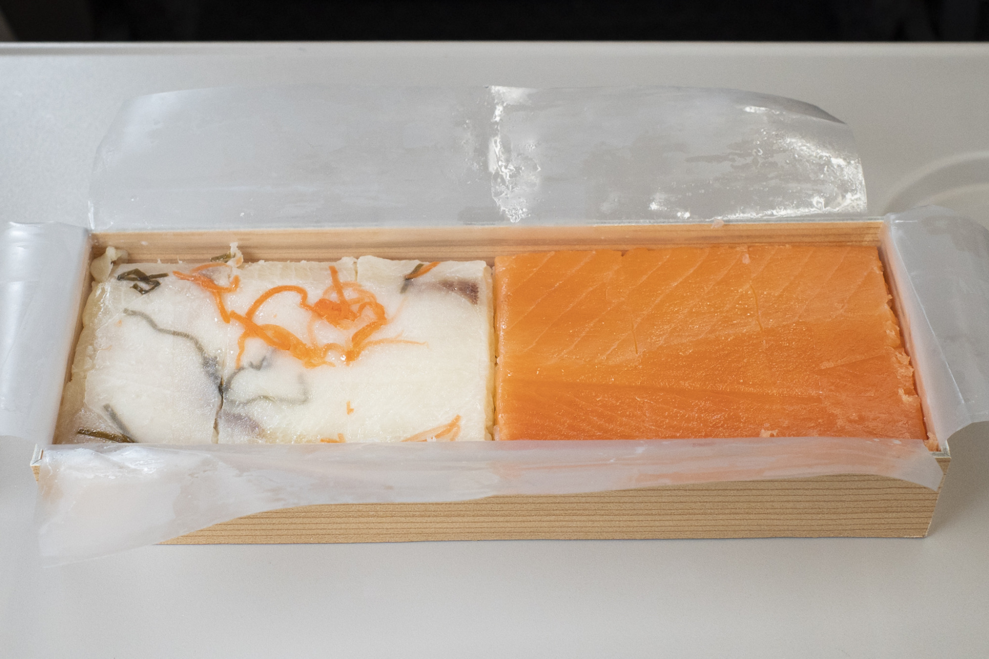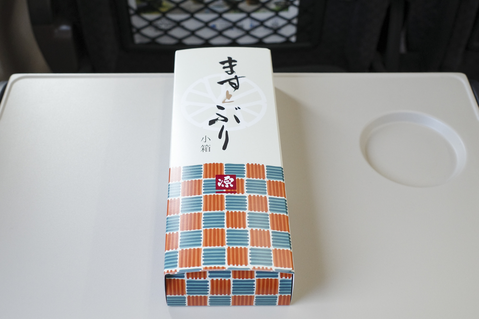 「ますのすし」と「ぶりのすし」を半分ずつ楽しめるお弁当がこちら。新幹線でも食べやすいサイズです。
