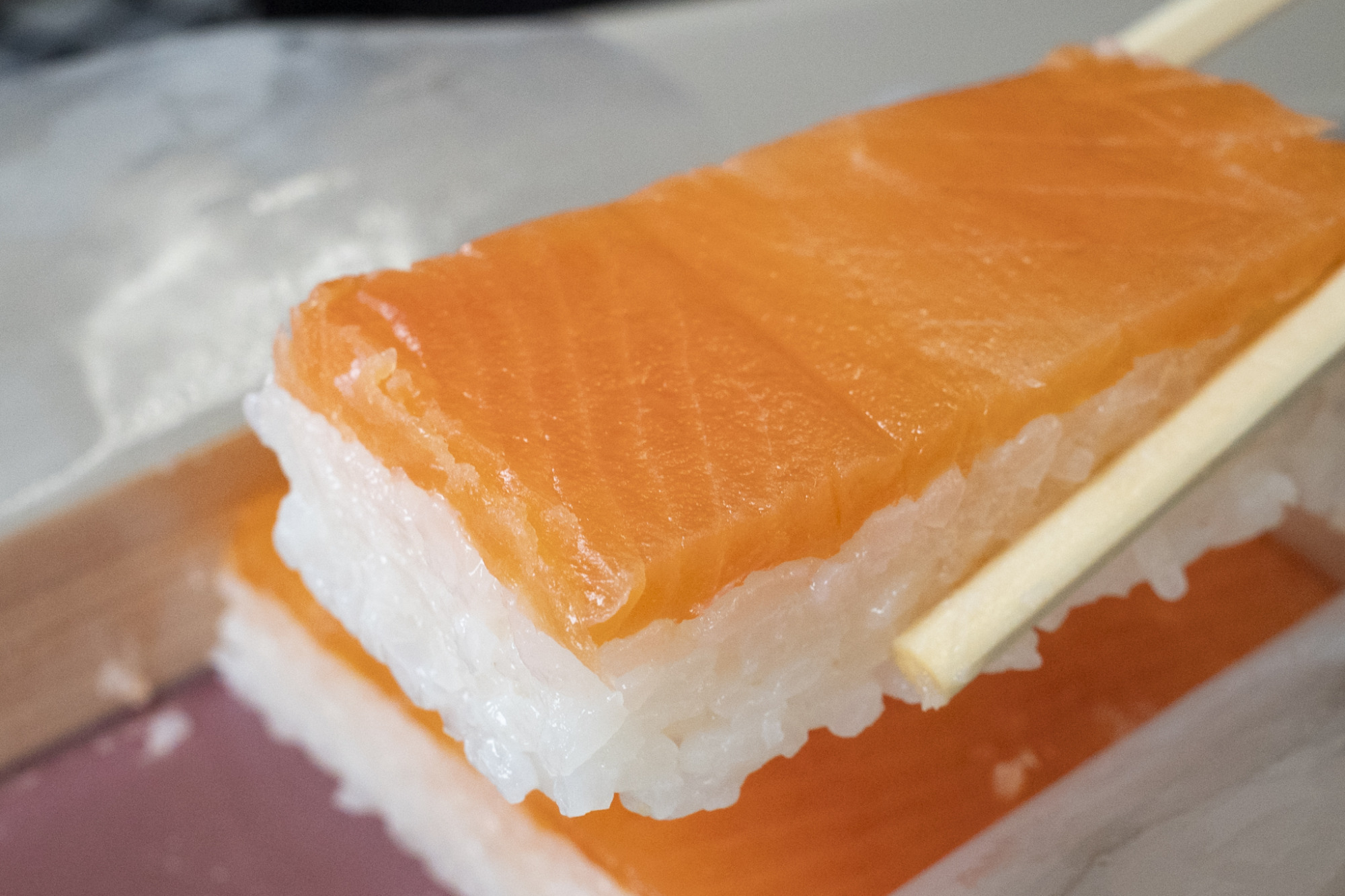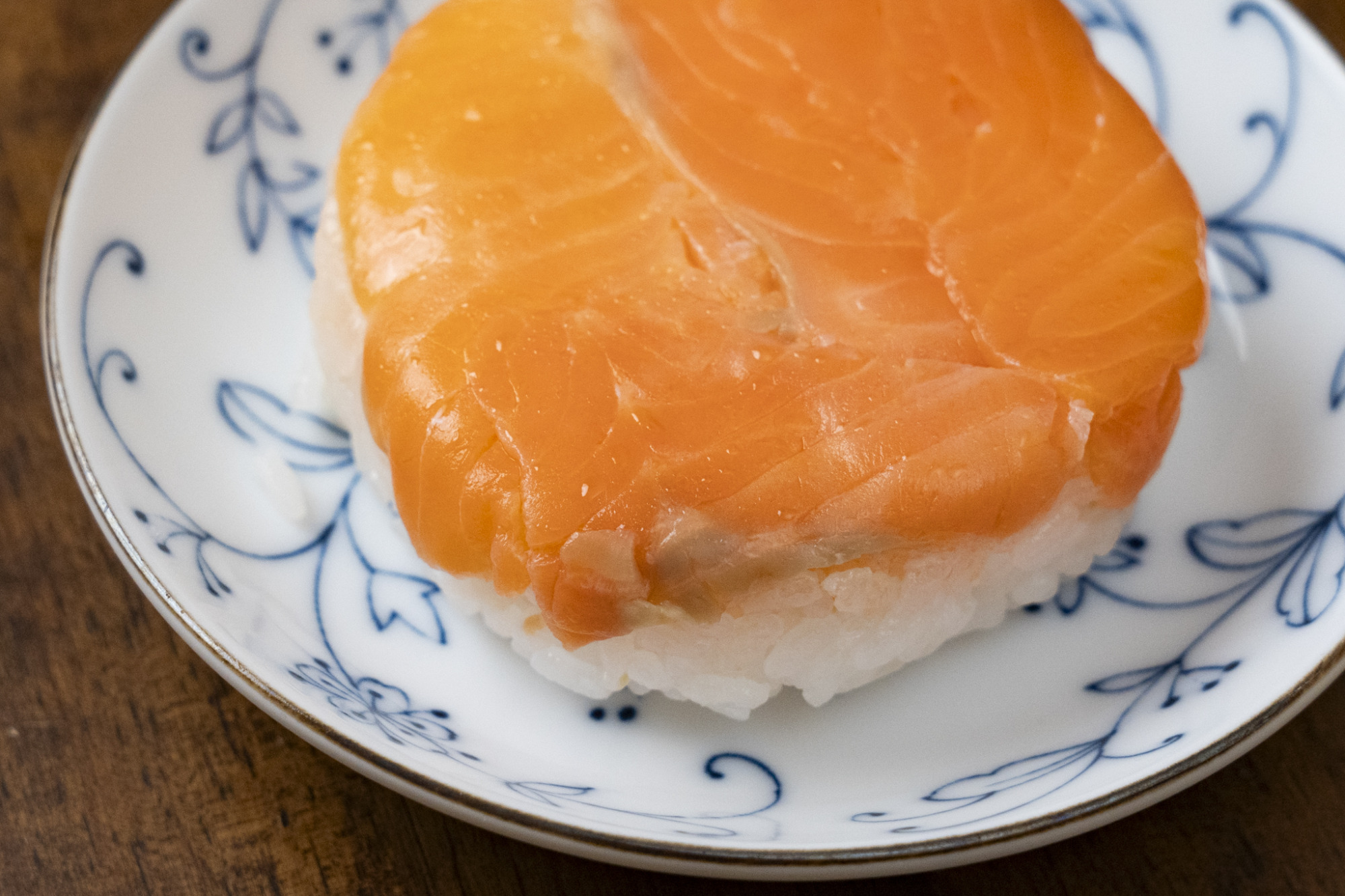 丸い形の押し寿司の上に、鮮やかな色のますの身がしっかりとのっています。