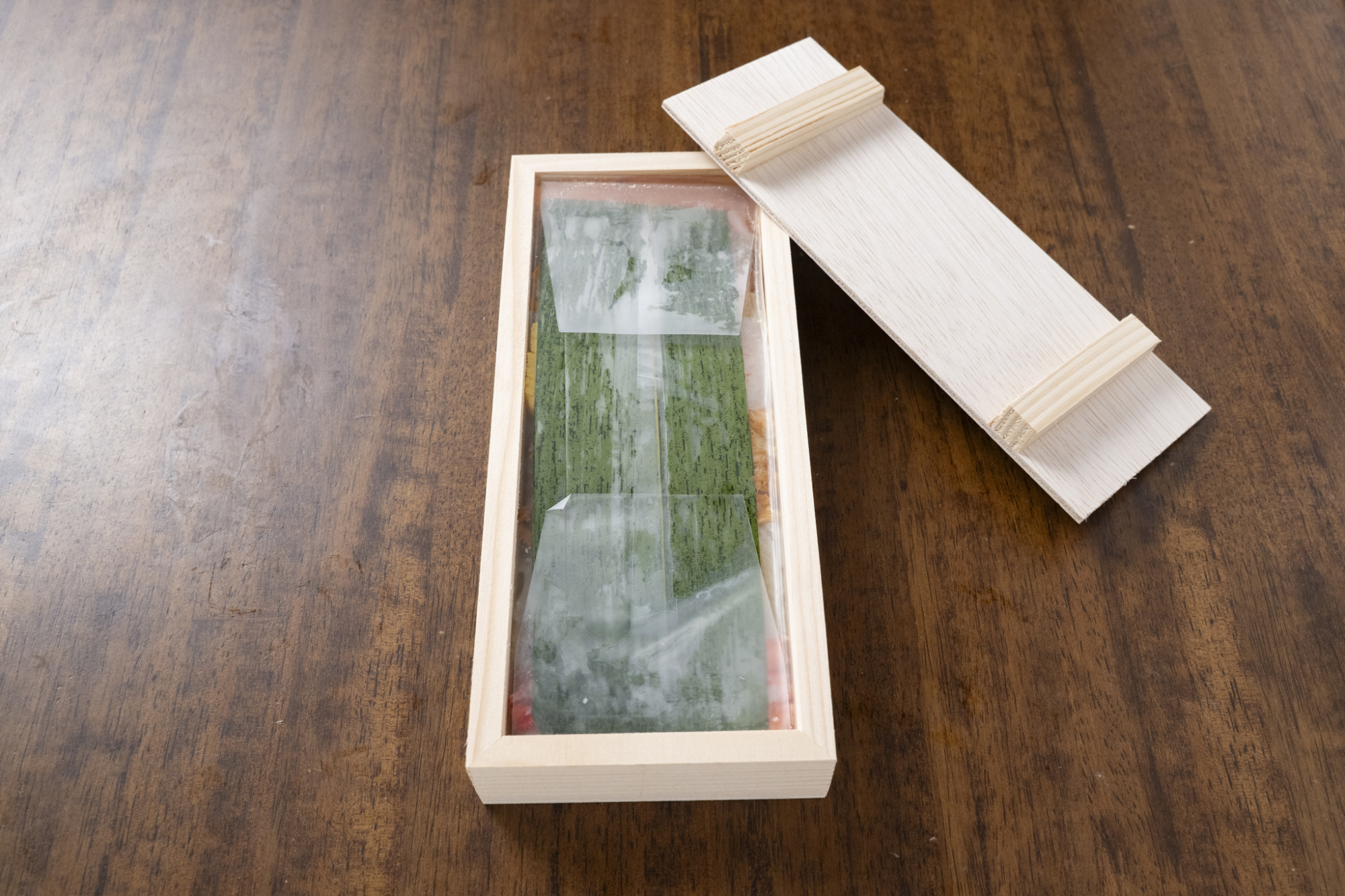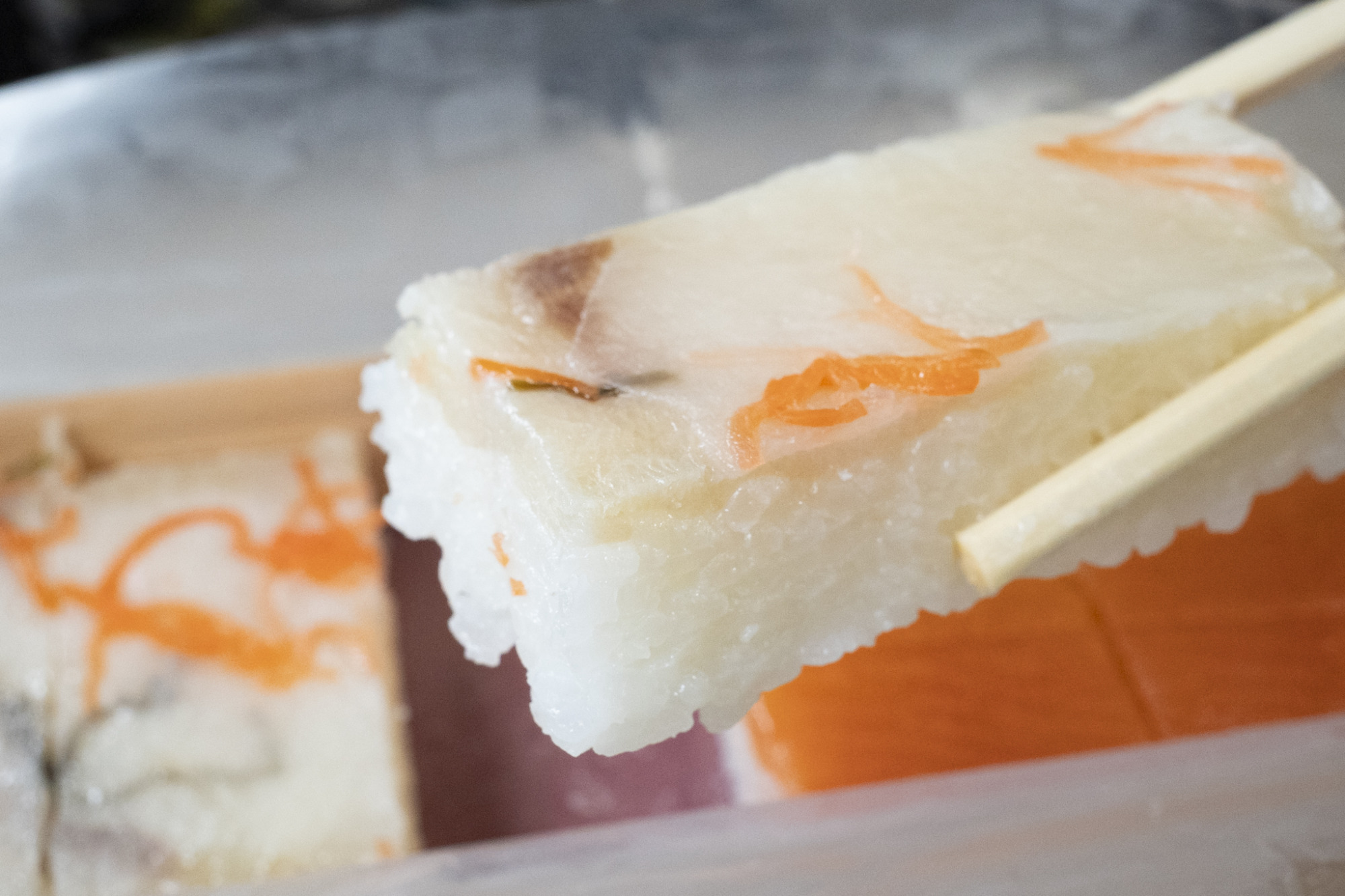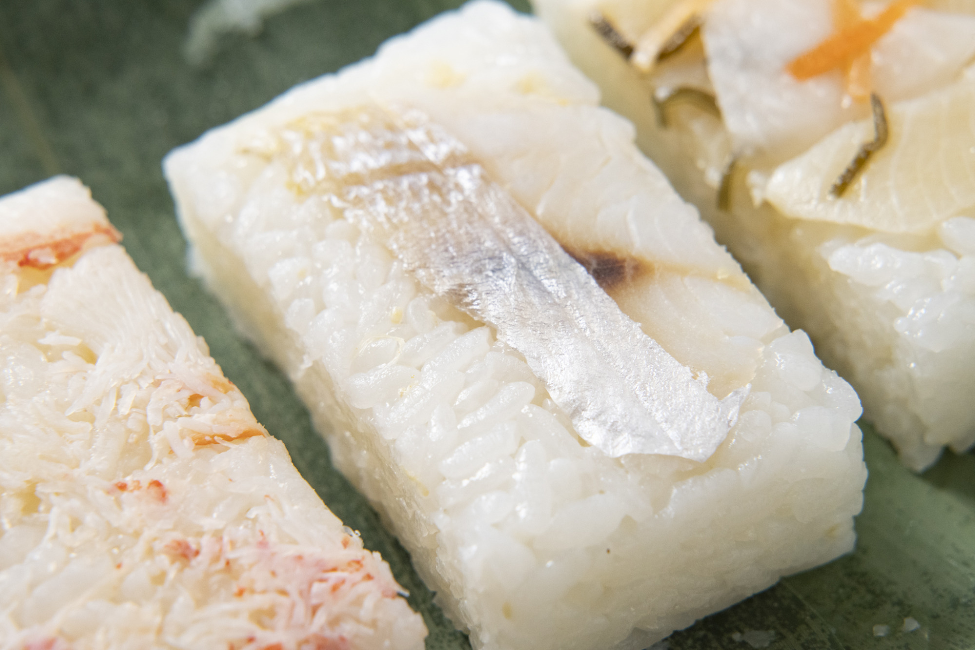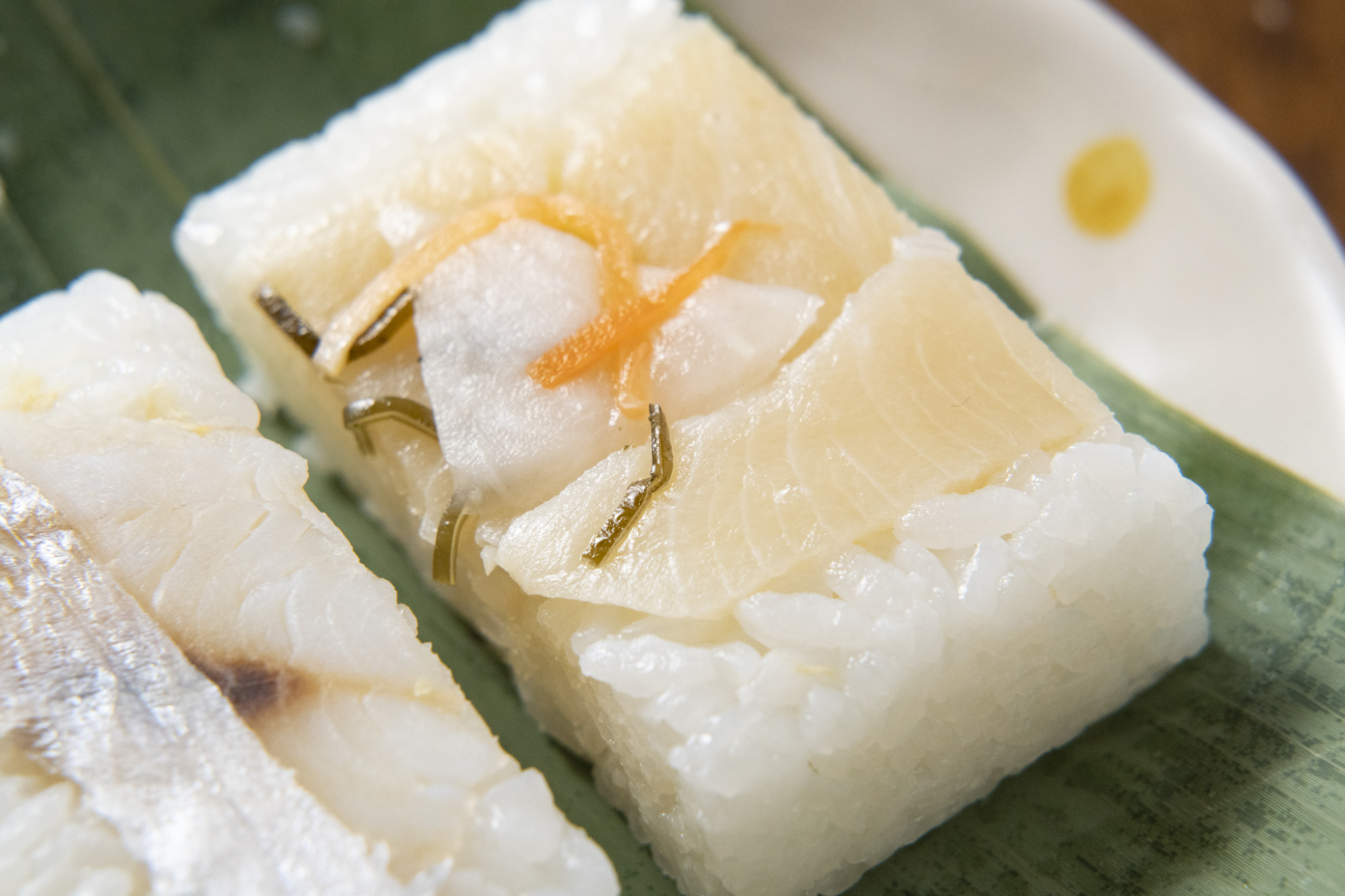 薄く切られた鯛の身が上品に乗った押し寿司。