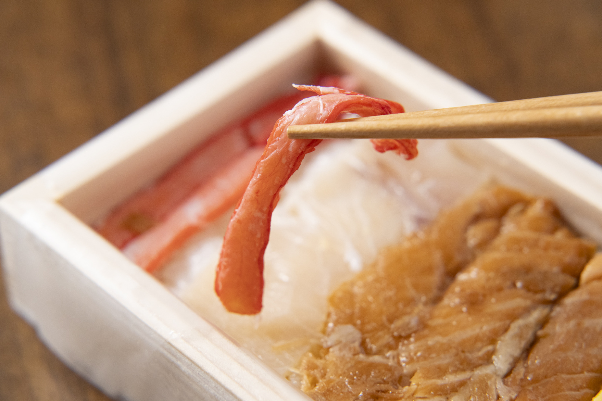 ふんわりとしたかにの食感と酢飯がよく合い、見た目にも華やかな味わいです。