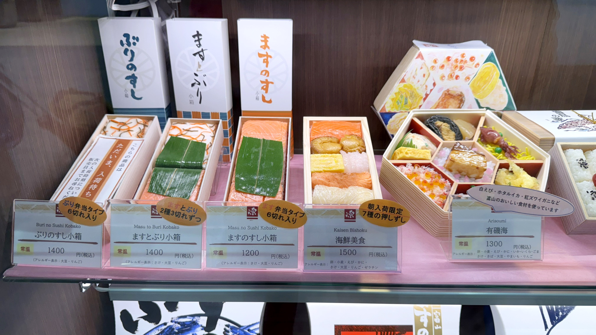 新高岡駅構内にある売店やコンビニには、ますを使用した定番の押し寿司「ます寿司」をはじめ、海鮮を詰め合わせたお弁当や、手軽に楽しめる一口サイズの寿司など富山らしい味が並びます。