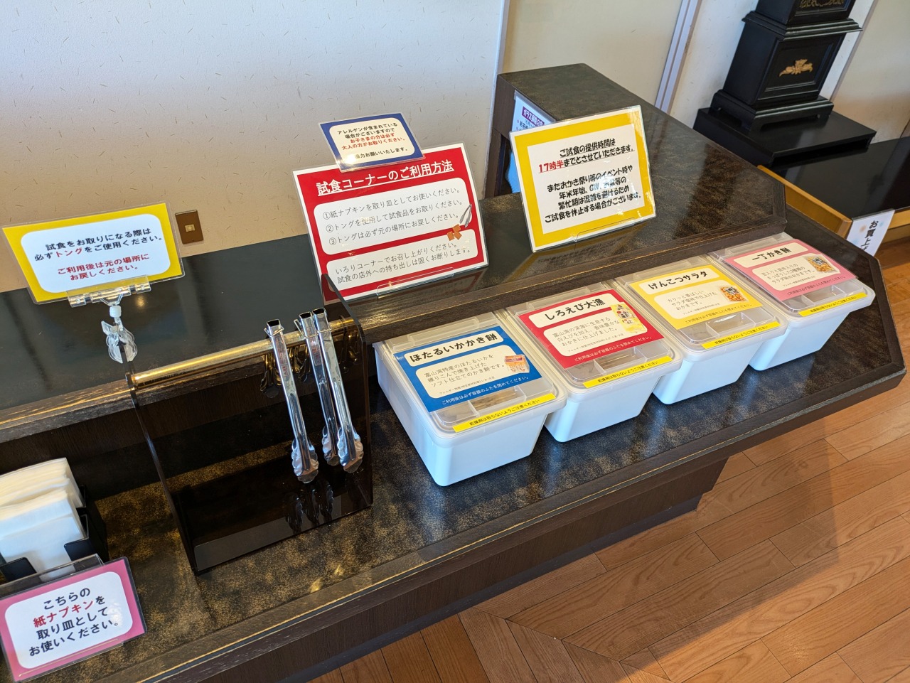 常時100種以上の商品が陳列されており、いろいろなおかき・あられを購入することができます。また、囲炉裏コーナーでは3~4種類のおかきの試食ができます。
