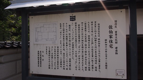 茅葺の主屋部と板葺の葺きおろしからなる、江戸時代の砺波地方の代表的茅葺民家です。佐伯家は旧蓑島村の旧家だった家柄であり、現在の建物は1767年旧川崎村の大庄屋だった三之助が建てたものを翌年佐伯家が買い取り移築したものです。江戸時代中期の高持農家では北側と南西側に屋敷林をめぐらし、門と離れ座敷、蔵などがありました。そんな当時の建築様式を茅葺きの母屋やひさし、広間などの柱や梁に垣間見ることができます。1971年に国の重要文化財に指定され、豪農の生活の一端がわかる貴重な建物として今も大切に保護されています。