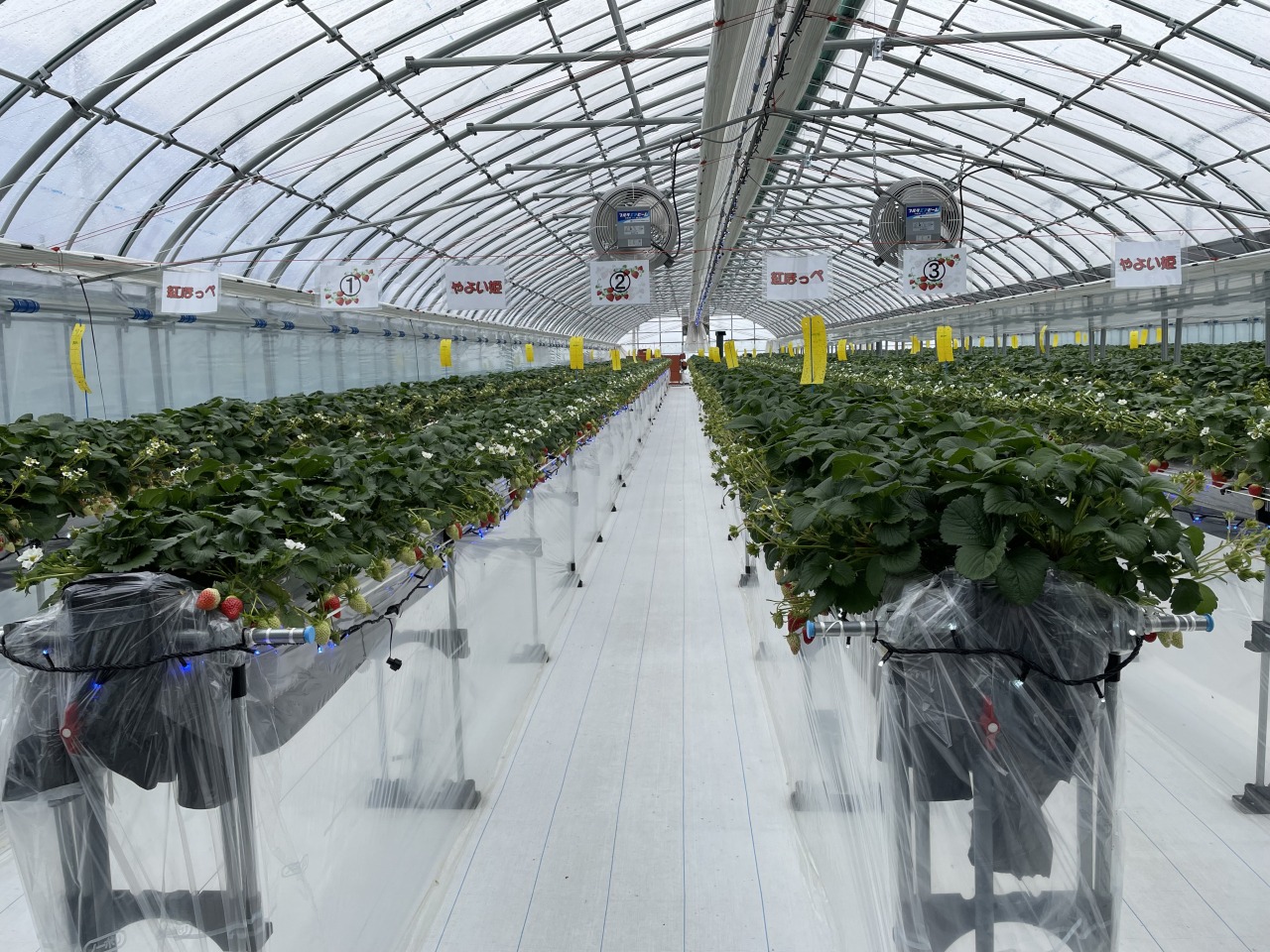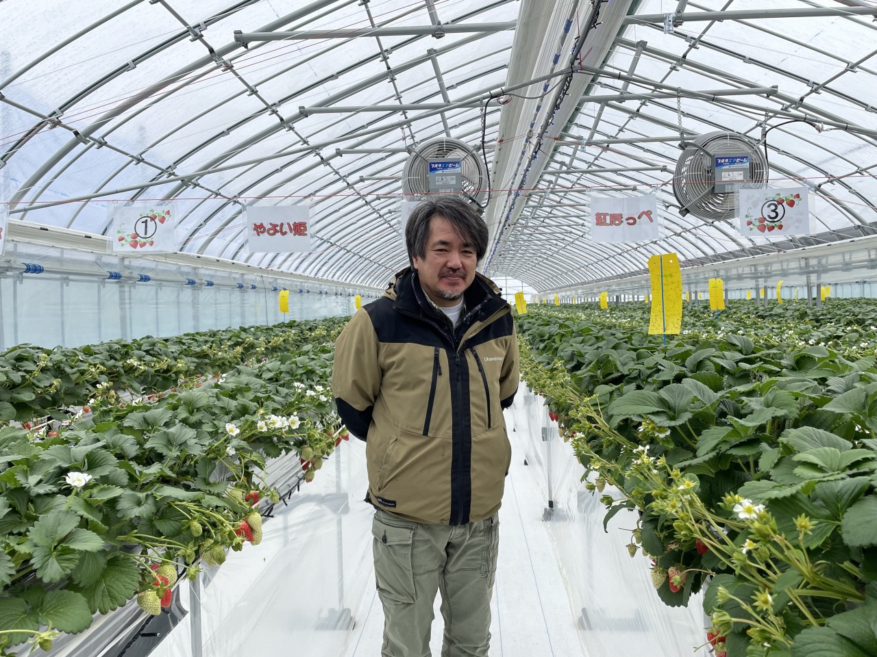 株式会社宇川農産では、令和2年にいちご栽培を開始しました。地面から1mほどの高さに土の入った培地を設置して苗を植えるイチゴの高設溶液栽培システムを導入し、スマートフォンなどによる遠隔制御で水や栄養液を与え、さらに温度、湿度、二酸化炭素量の管理もデジタル化されています。これにより、畑で育てるより、病虫害が抑えられ、大粒で糖度が高い、いちごが収穫できます。