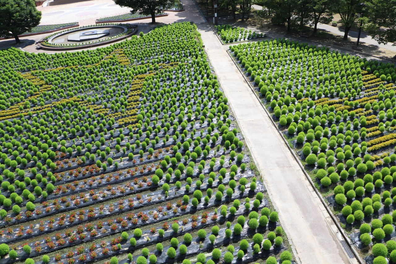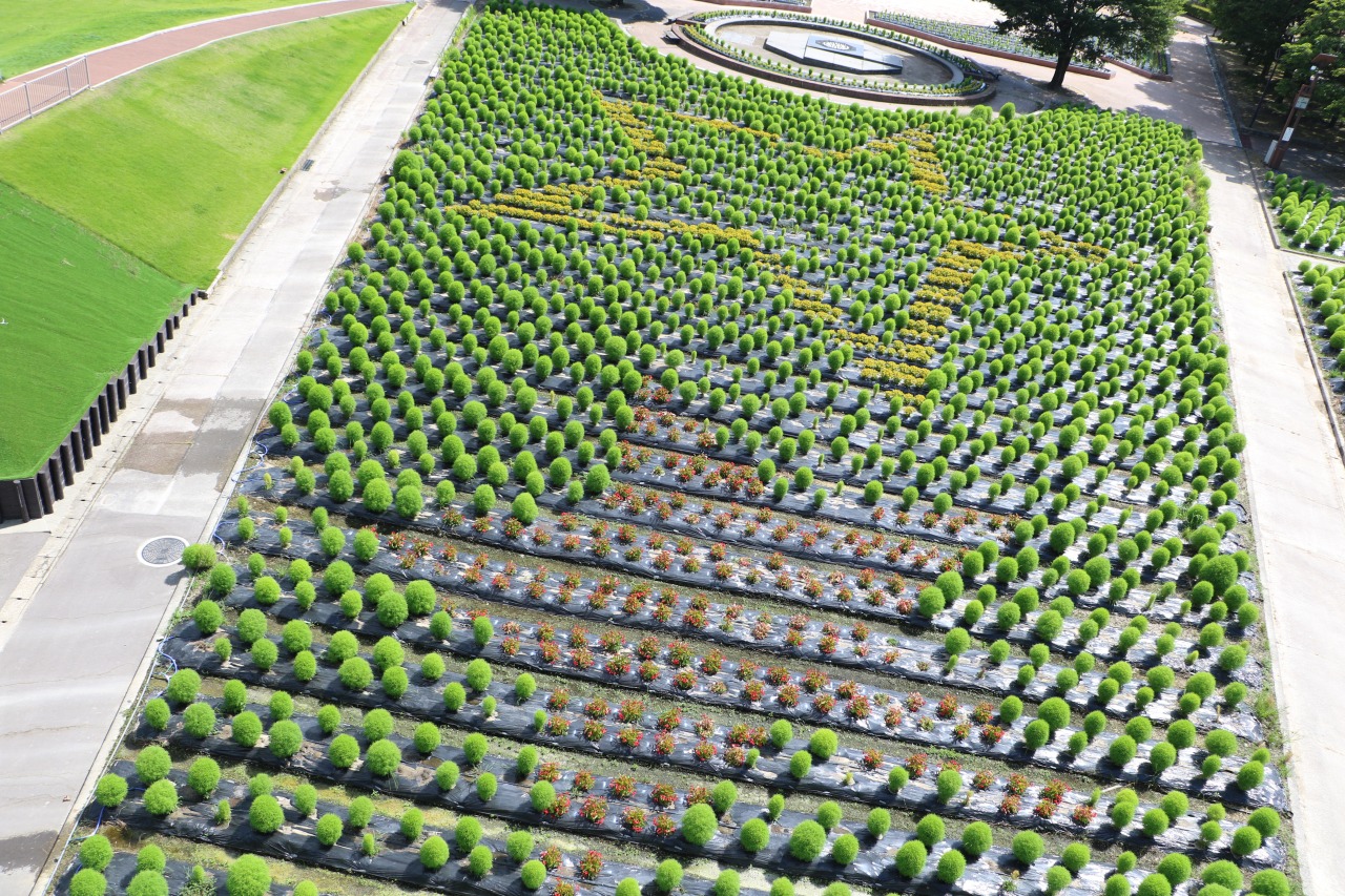 チューリップタワーに上って大花壇を見てみると、たくさんのコキアの中で、黄色いメランポジウムと赤いベゴニアドラゴンウィングで描く大きな星の形が見えてきます。