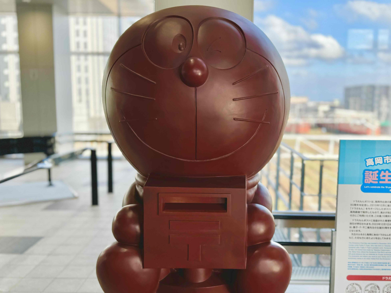 高岡駅の改札前には、伝統産業「高岡銅器」の技術で制作された大きなドラえもんポストがあります。